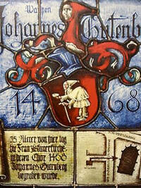 Das große Gutenberg-Bild zeigt in 2/3 der Fläche im oberen Bereich mit hellblauem Hintergrund das Wappen der Familie Johannes Gutenbergs mit dem Motiv des Pilgers mit der Schale in rot/silber sowie die Jahreszahl seines Sterbejahres 1468.
